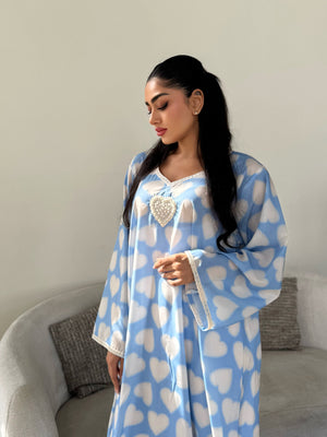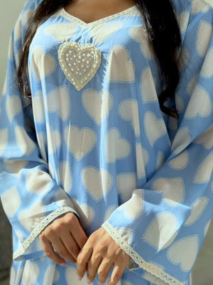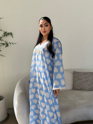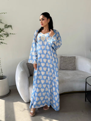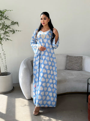 The Heart Jalabiya is made from soft, breathable cotton. Its charming heart pattern gives it a unique appeal. The relaxed silhouette offers a comfortable fit, while the delicate lace details on the cuffs and neckline add a touch of elegance. The lightweight fabric ensures ease of movement, making it a perfect choice for everyday wear.