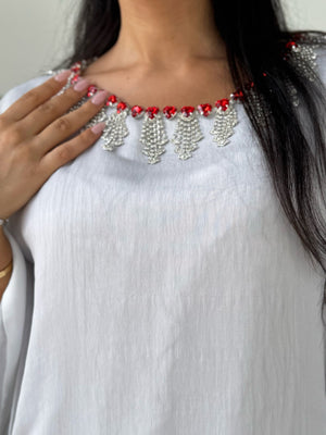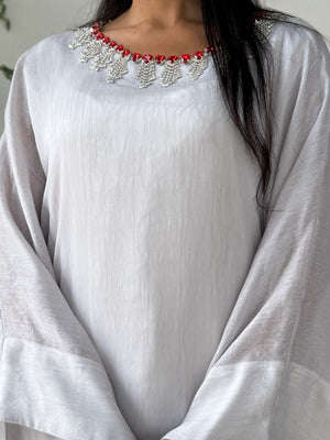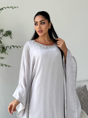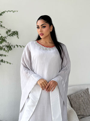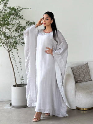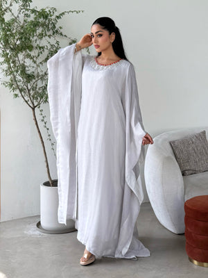 Elevate your wardrobe with this sophisticated Krystal Jalabiya, crafted from a light, double-layer smooth fabric that exudes elegance and chic style. The flowing cut and luxurious fabric ensure a graceful silhouette, making it the perfect choice for special occasions. The unique design features a meticulously crafted neckline adorned with delicate embellishments that add a touch of glamour and sophistication. The graceful butterfly sleeves enhance the overall elegance, creating a timeless piece that stands out in any setting.