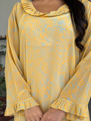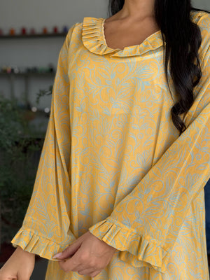 Ruffled Neckline and Cuffs: Adds a feminine touch with delicate ruffle detailing on the neckline and cuffs.