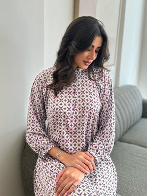Embrace timeless sophistication with the Noor Jalabiya. Crafted from luxurious silk, this piece offers unmatched comfort and breathability. The intricate geometric pattern in soft hues brings a contemporary touch to its classic design. Featuring a buttoned neckline and chest, this jalabiya combines practicality with style. The flowing cut ensures a relaxed fit, perfect for all-day wear. The high neckline adds a refined touch, while the detailed cuffs complete the look with elegance. Lightweight and durable, the Noor Jalabiya is ideal for warm weather, making it a versatile addition to your wardrobe.