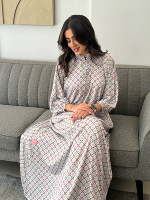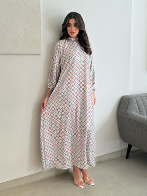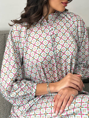 Embrace timeless sophistication with the Noor Jalabiya. Crafted from luxurious silk, this piece offers unmatched comfort and breathability. The intricate geometric pattern in soft hues brings a contemporary touch to its classic design. Featuring a buttoned neckline and chest, this jalabiya combines practicality with style. The flowing cut ensures a relaxed fit, perfect for all-day wear. The high neckline adds a refined touch, while the detailed cuffs complete the look with elegance. Lightweight and durable, the Noor Jalabiya is ideal for warm weather, making it a versatile addition to your wardrobe.