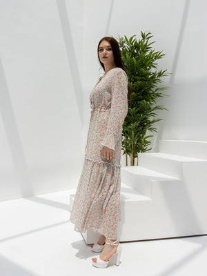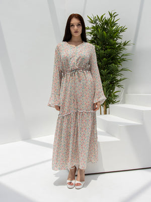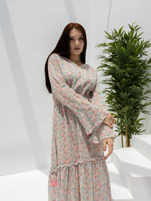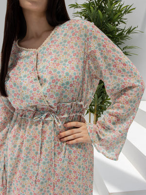 Made from breathable cotton, the Paradise Jalabiya provides cool comfort for hot weather home wear. The jalabiya features a relaxed and flowing cut that flatters all body types. Its soft pastel floral design adds elegance to your daily home attire. The waist cut is complemented by an adjustable belt, allowing for a perfect fit. The V-neckline is accentuated with delicate buttons and intricate lace, adding a stylish touch. The bottom of the jalabiya features a ruffled hem that enhances its flowy and feminine look. Button placket features intricate lace detailing.