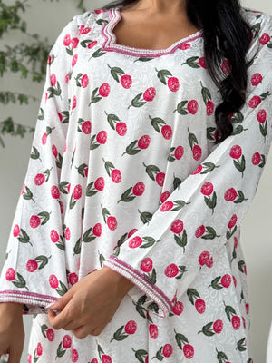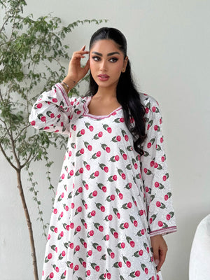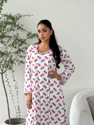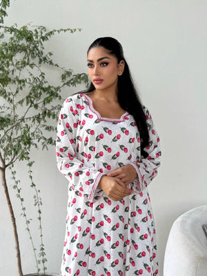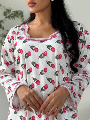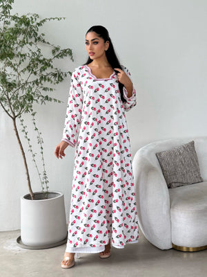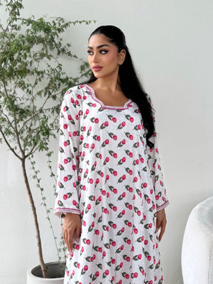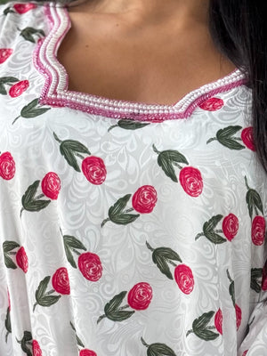 The Pink Tulips Jalabiya is crafted from premium silk jacquard fabric, offering elegance and comfort in one luxurious design. Its standout feature is a square collar intricately embroidered with pearls, making it a timeless addition to your wardrobe for formal events or sophisticated daily wear.