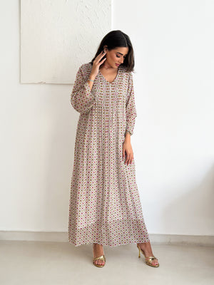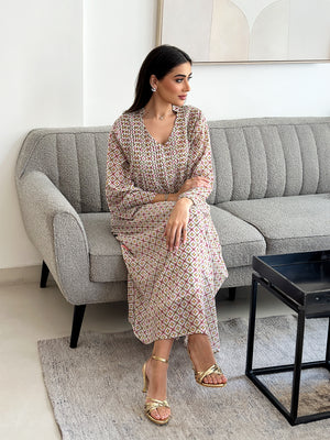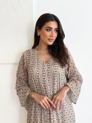 The Ruby Jalabiya, crafted from breathable cotton fabric, offers ultimate comfort and style. Its classic design features a delicate geometric pattern, making it a versatile addition to your wardrobe. This jalabiya provides a relaxed fit with a flowing cut, perfect for daily wear in hot weather. The elegant neckline adds a touch of sophistication and simplicity to the overall look.