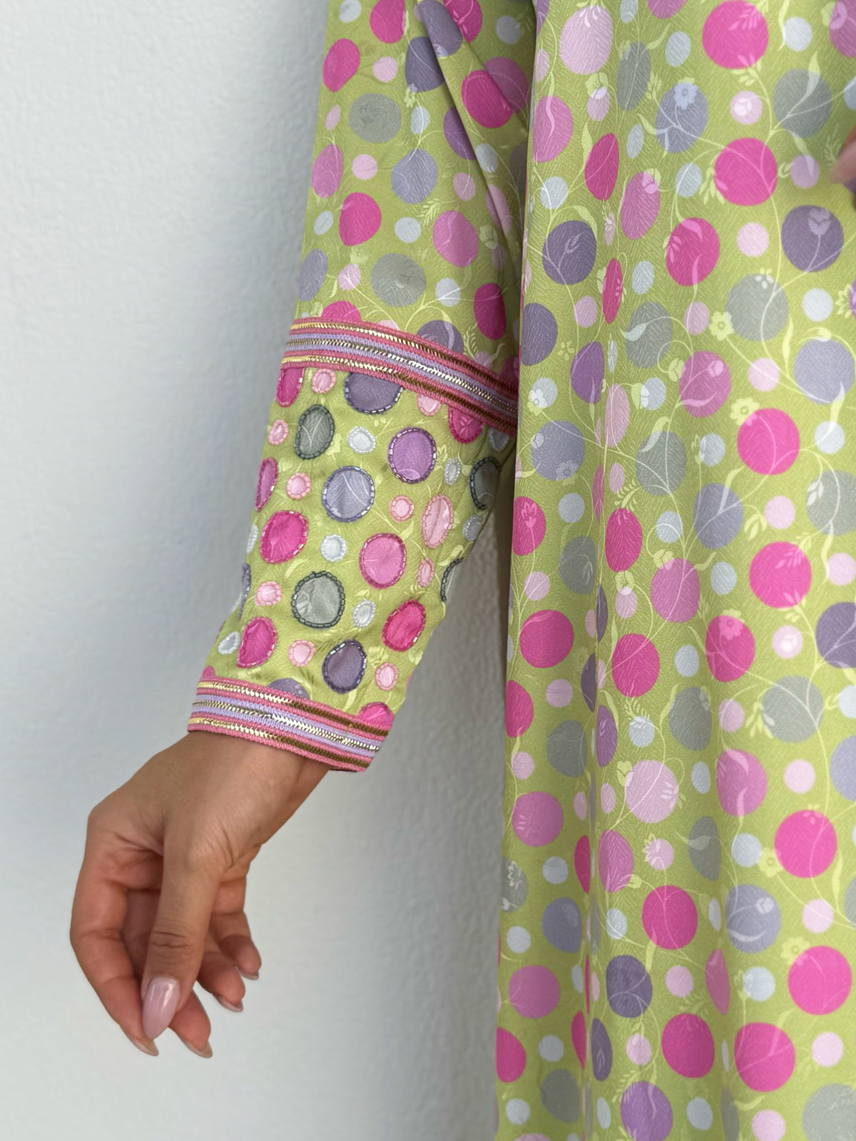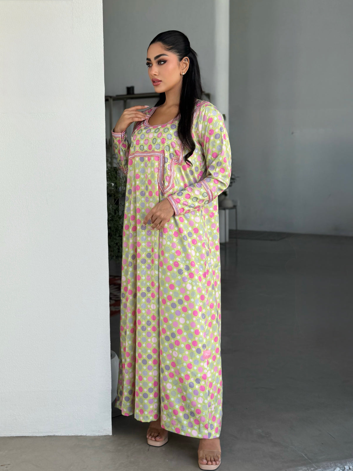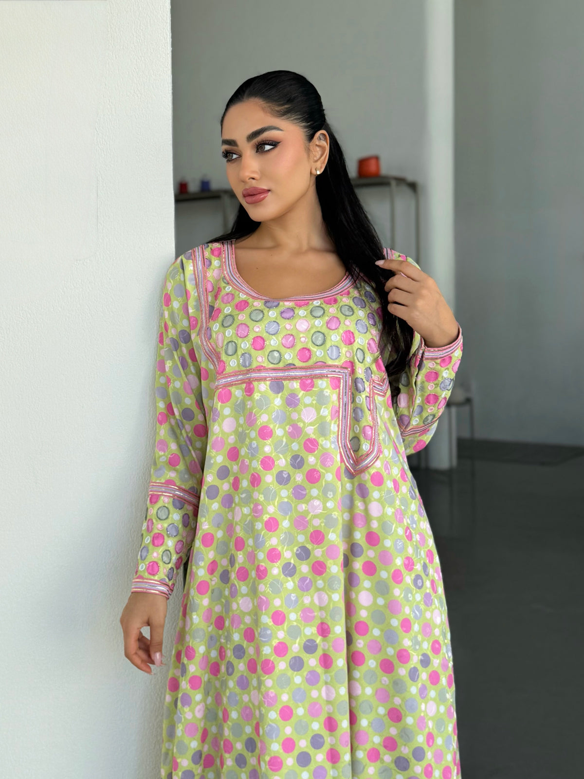 Indulge in the elegance of the Almuhrah Jalabiya, meticulously crafted from luxurious silk jacquard fabric. This vibrant piece features an intricate polka-dot design and detailed embellishments, offering a chic blend of tradition and modernity. Perfect for any occasion, this jalabiya ensures a graceful and comfortable wear.