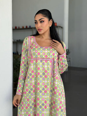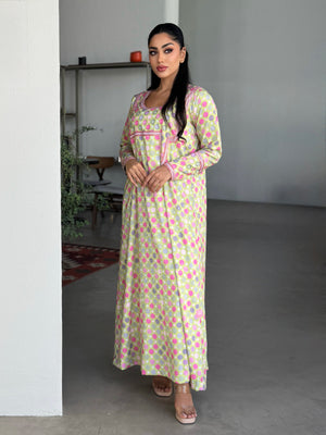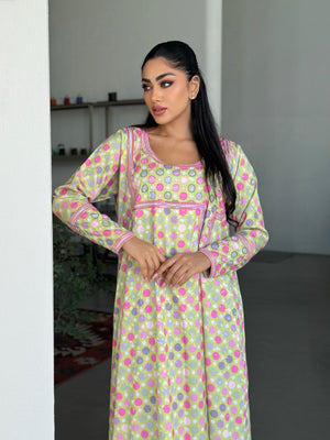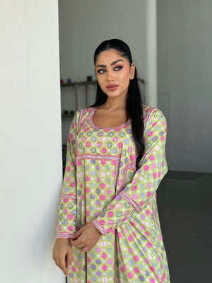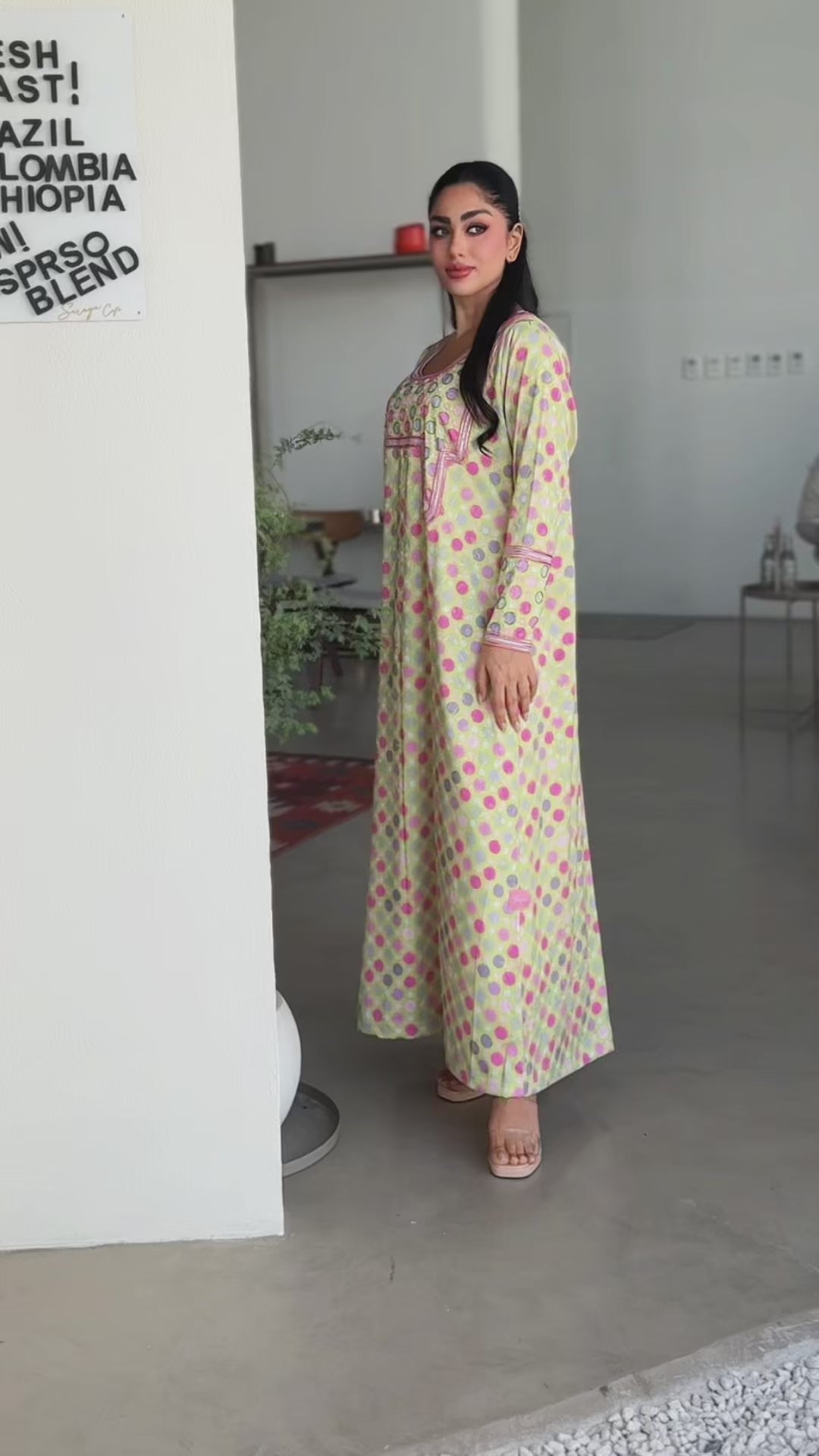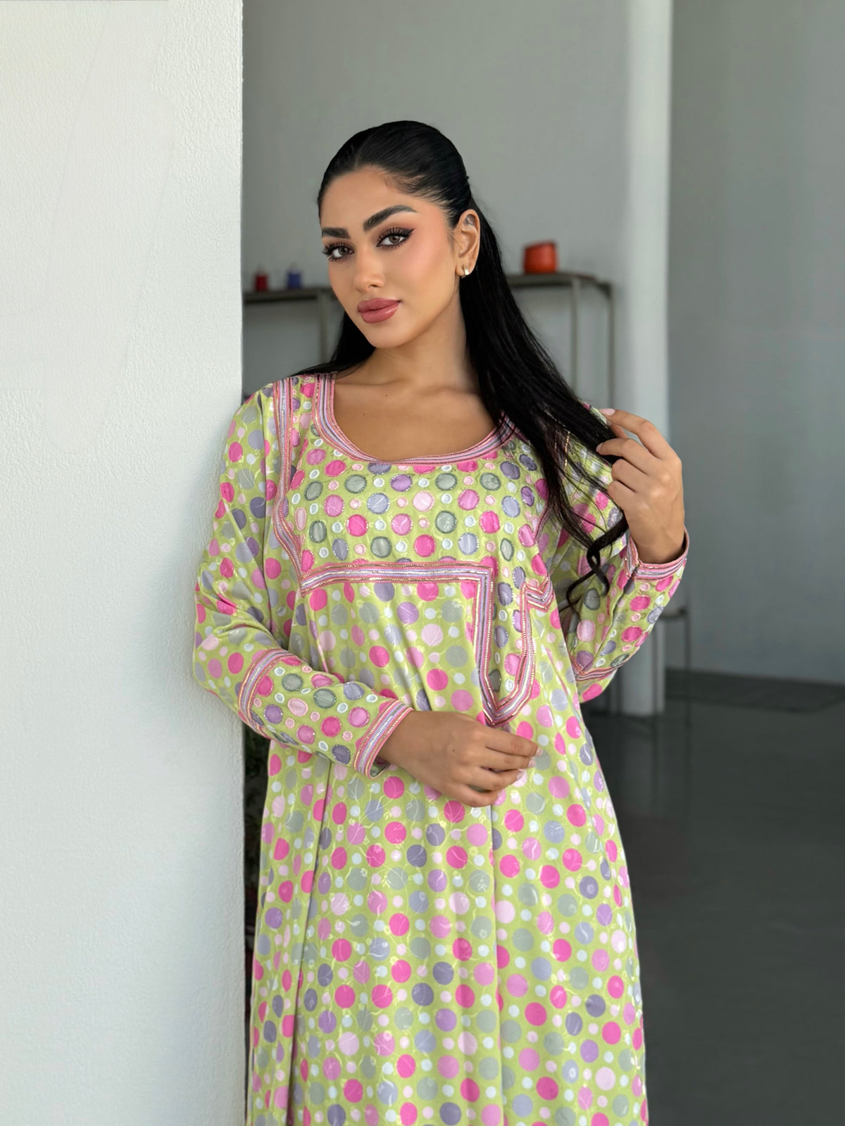 Indulge in the elegance of the Almuhrah Jalabiya, meticulously crafted from luxurious silk jacquard fabric. This vibrant piece features an intricate polka-dot design and detailed embellishments, offering a chic blend of tradition and modernity. Perfect for any occasion, this jalabiya ensures a graceful and comfortable wear.