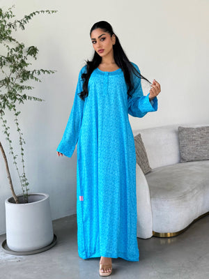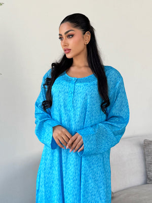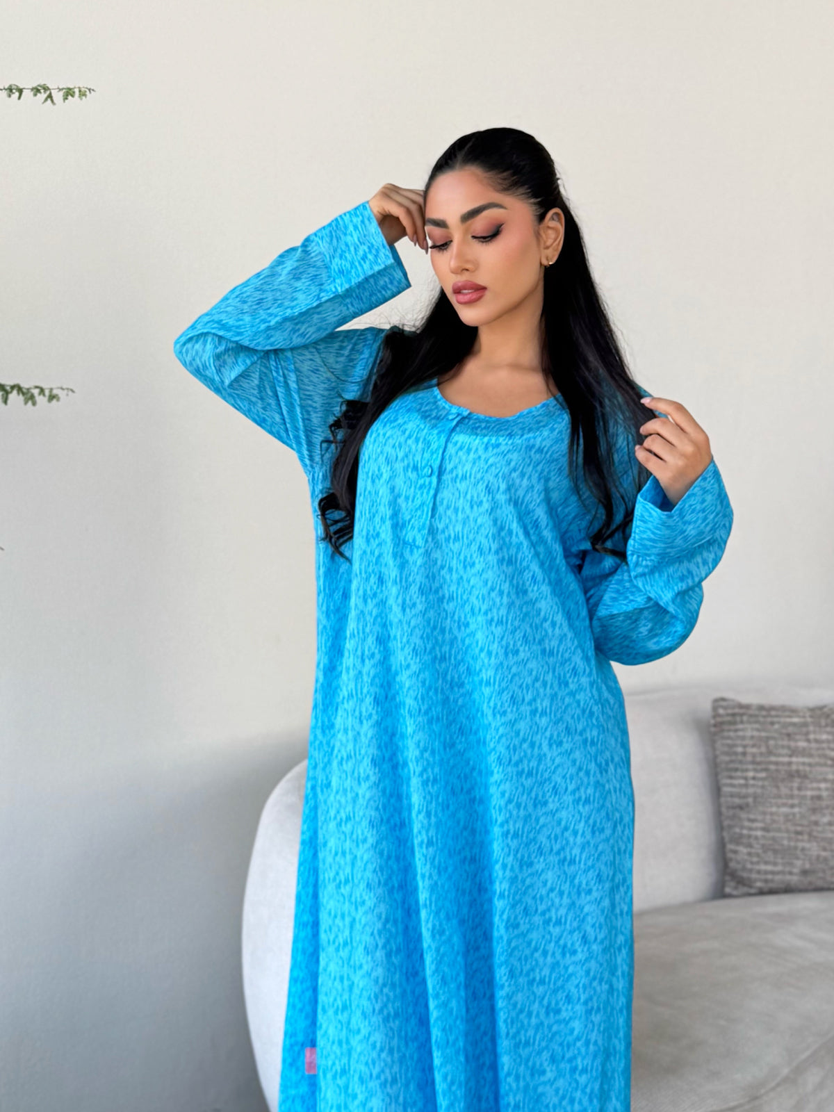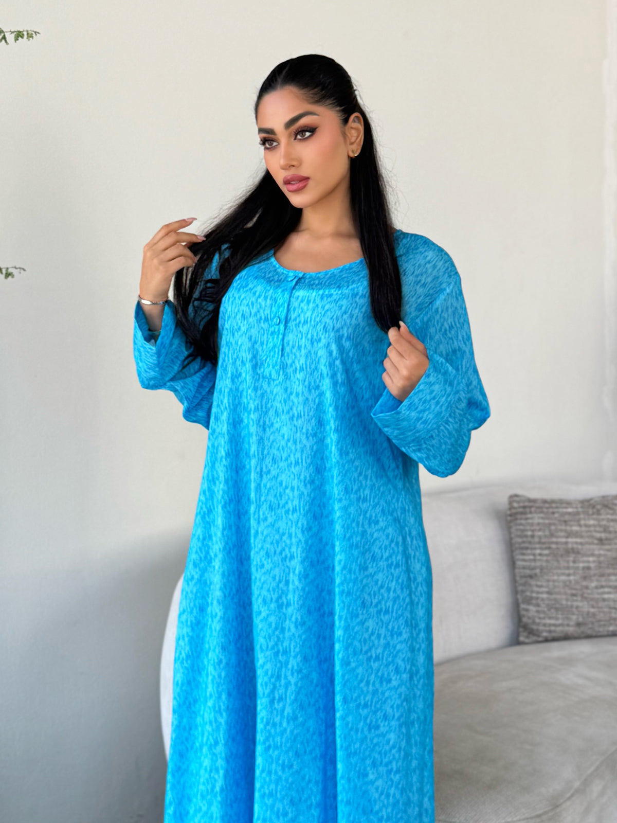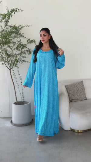 Crafted from silky soft fabric, the Aurora Jalabiya ensures comfort and style for daily home wear. The jalabiya features a relaxed and flowing cut that allows for easy movement and a stylish appearance. Its subtle design adds a touch of elegance to your home wardrobe. The round neckline is complemented by a small placket with buttons on the chest, adding a simple yet charming detail. The sleeves are three-quarter length, offering comfort, making it ideal for various activities around the house.
