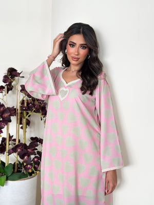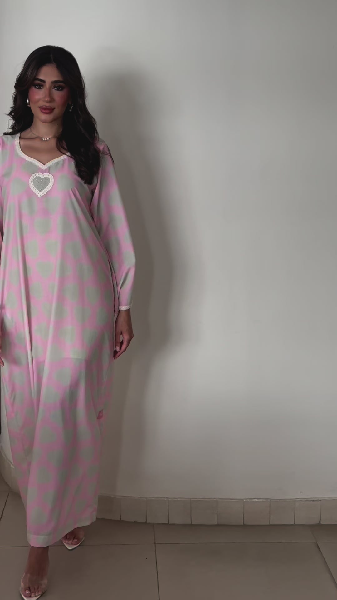 The Heart Jalabiya is made from soft, breathable cotton. Its charming heart pattern gives it a unique appeal. The relaxed silhouette offers a comfortable fit, while the delicate lace details on the cuffs and neckline add a touch of elegance. The lightweight fabric ensures ease of movement, making it a perfect choice for everyday wear.