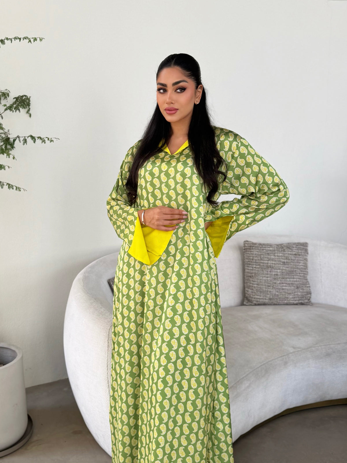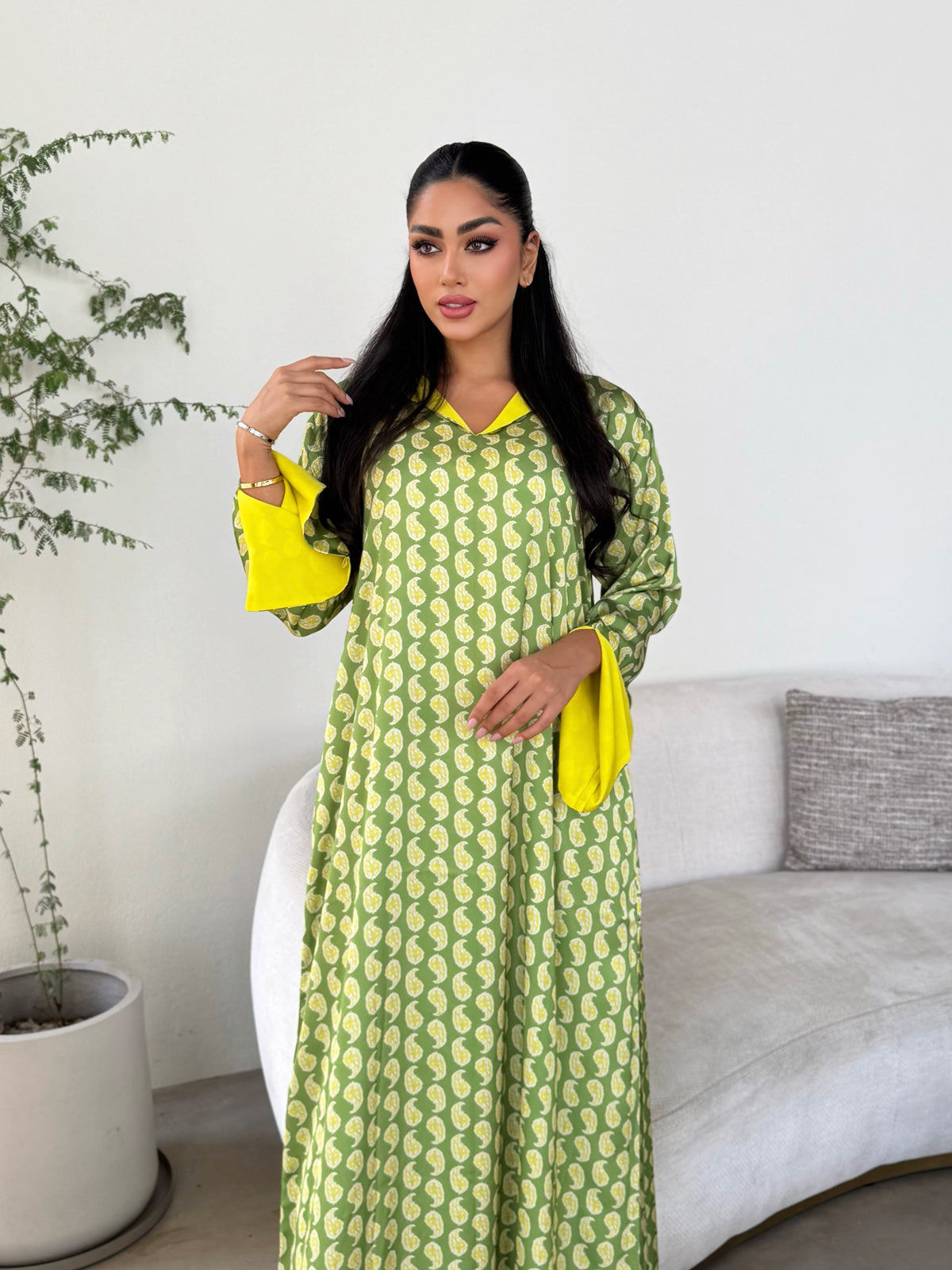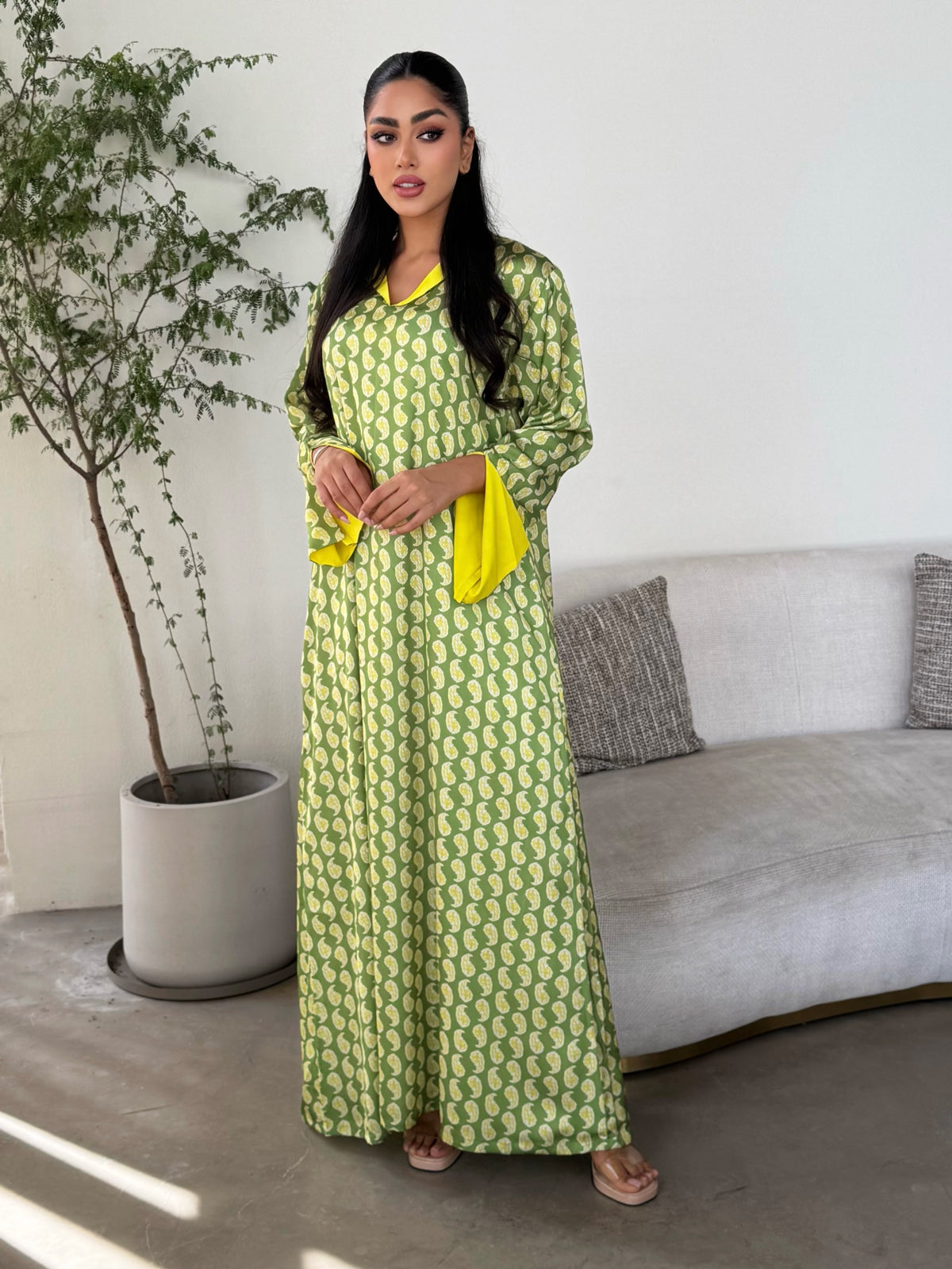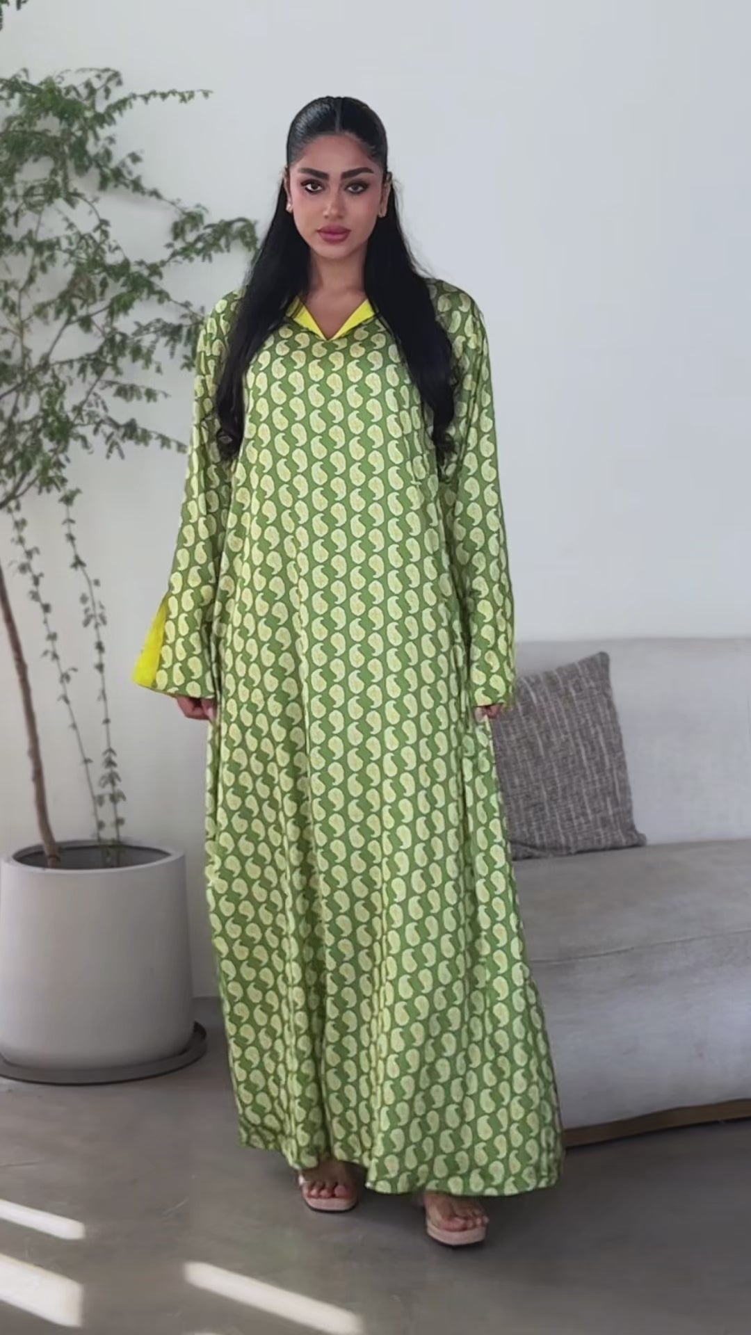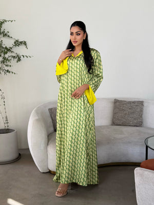 This Lara Silk Jalabiya features a sophisticated print design, combining simplicity and elegance. The cut is relaxed and flowing, providing both comfort and style. The cuffs are designed with a contrasting yellow lining, adding a subtle yet striking detail to the overall look. In addition, offers ease of movement and a relaxed fit. The neckline is a chic V-neck with a contrasting yellow collar, enhancing the jalabiya's unique and stylish appearance.