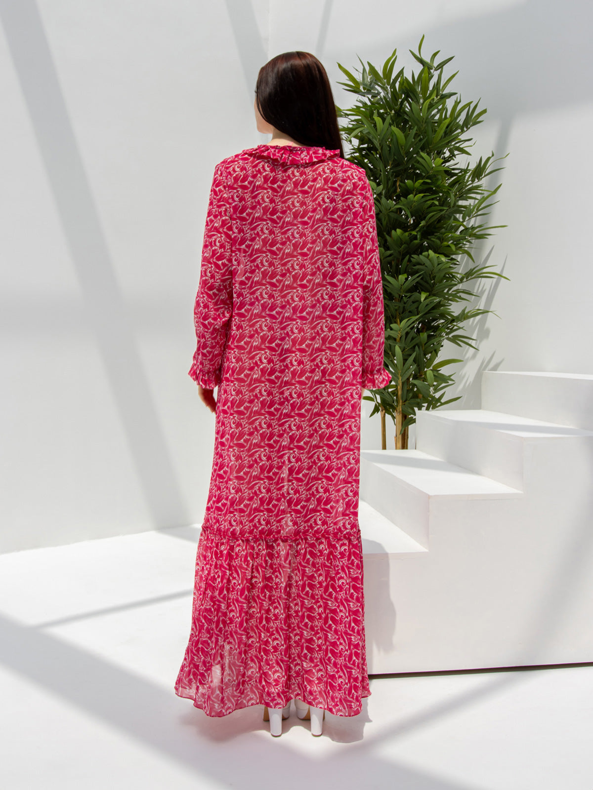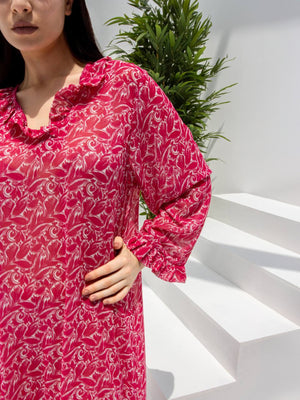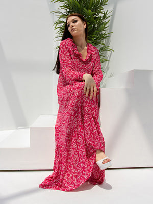 The Luna Dress, made from silky soft fabric, offers a unique combination of elegance and comfort. This dress features a relaxed, flowing silhouette perfect for home wear. The vibrant floral print adds a touch of freshness, while the soft ruffled neckline brings a charming detail to the overall design. The dress has a gentle V-neck collar adorned with subtle ruffles, complementing the ruffled cuffs that add a playful touch. A distinctive design element is the cut from the middle of the dress, creating a tiered effect that adds movement and dimension.