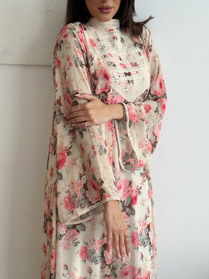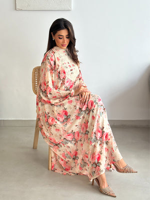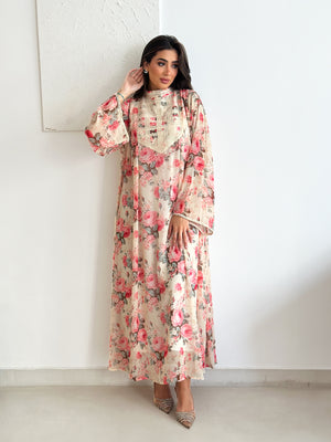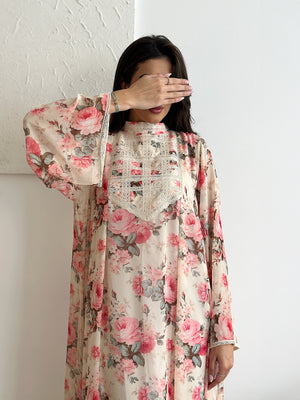 Embrace the beauty of classic elegance with the Mira Jalabiya. Crafted from chiffon fabric adorned with rose prints, this jalabiya is a stunning addition to any wardrobe. The piece is meticulously stitched with hand-embroidered cotton French lace, adding a touch of sophistication and heritage to its design.