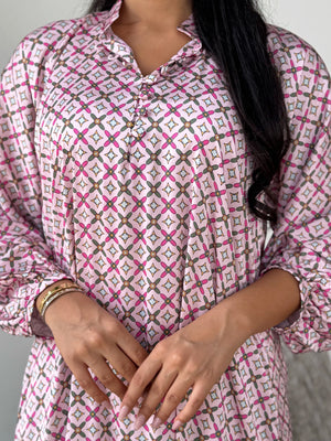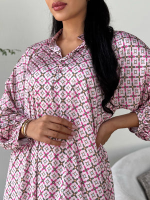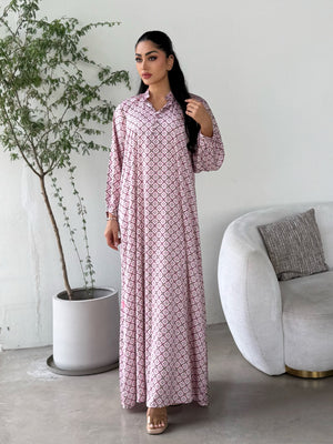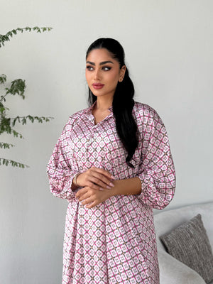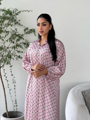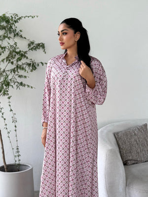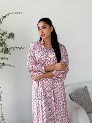Embrace timeless sophistication with the Noor Jalabiya. Crafted from luxurious silk, this piece offers unmatched comfort and breathability. The intricate geometric pattern in soft hues brings a contemporary touch to its classic design. Featuring a buttoned neckline and chest, this jalabiya combines practicality with style. The flowing cut ensures a relaxed fit, perfect for all-day wear. The high neckline adds a refined touch, while the detailed cuffs complete the look with elegance. Lightweight and durable, the Noor Jalabiya is ideal for warm weather, making it a versatile addition to your wardrobe.