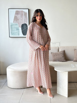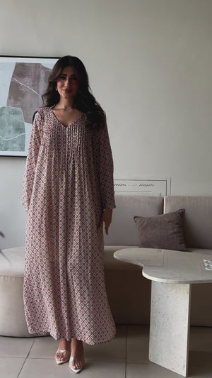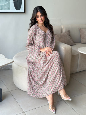 The Ruby Jalabiya, crafted from breathable cotton fabric, offers ultimate comfort and style. Its classic design features a delicate geometric pattern, making it a versatile addition to your wardrobe. This jalabiya provides a relaxed fit with a flowing cut, perfect for daily wear in hot weather. The elegant neckline adds a touch of sophistication and simplicity to the overall look.